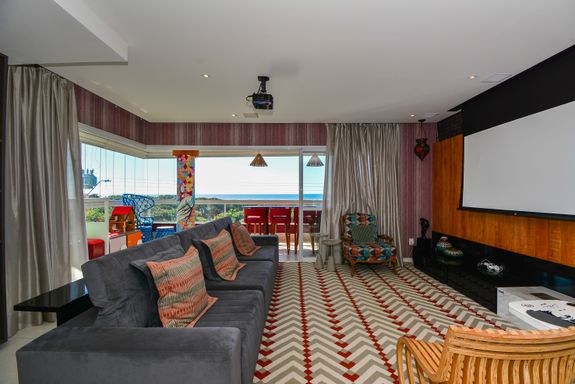 Distribuído em planta inteligente, o apartamento oferece três suítes amplas, incluindo uma suíte master com vista direta para o mar, closet generoso e banheiro com acabamentos premium. Os ambientes são iluminados, arejados e envoltos por amplas aberturas que enquadram o azul do oceano em cada detalhe do projeto.