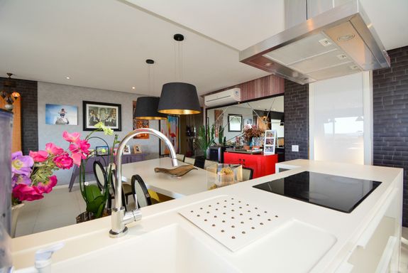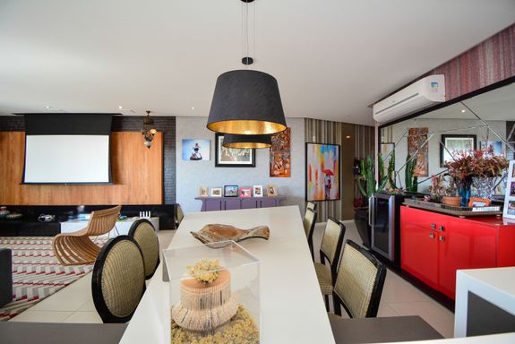 O living principal se conecta à varanda com vista aberta, criando uma atmosfera perfeita para contemplar o nascer do sol ou receber convidados com charme e elegância. A cozinha gourmet integrada traz praticidade sem abrir mão do design, equipada com eletros embutidos, marcenaria sob medida e bancadas em granito.